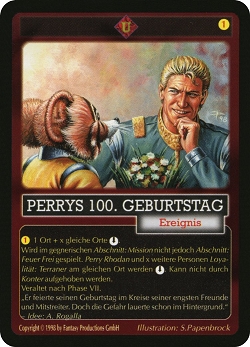| 1998 | Perrys 100. Geburtstag konnte man bei einer Umtauschaktion für 100 Sammelkarten diese Sammelkarte bei Beyond the Limit eintauschen. Ende 2007 ist diese Sammelkarte teilweise in 1000 Stück Packungen auf den Markt geworfen worden durch Beyond the Limit. Diese Sammelkarte wurde gedruckt mit dem Rare Druckbogen von Firestorm. | ![]() ![]() |